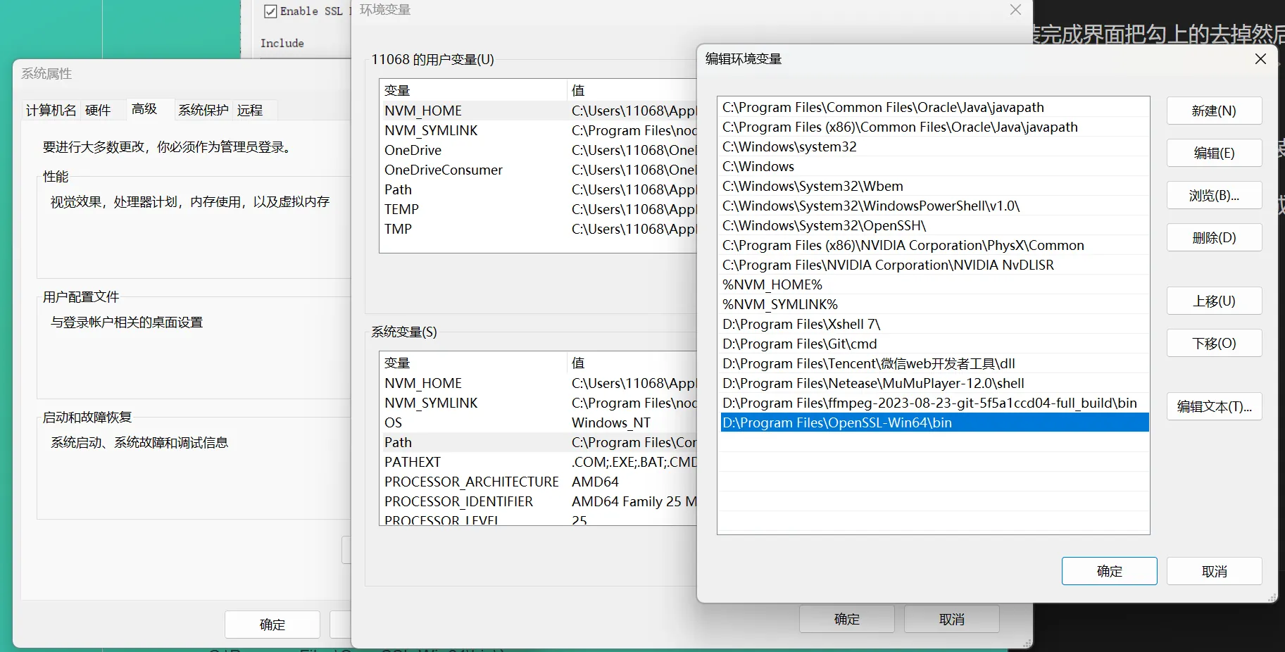 - 在弹出的新窗口中点击新建,把你的Openssl可执行文件所在路径复制进去(如果没改动安装路径就是C:\Program Files\OpenSSL-Win64\bin\)