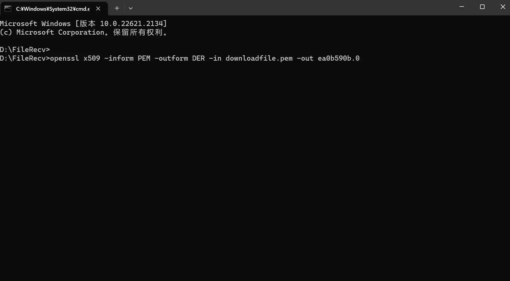 在保存文件的路径打开控制台,先输入openssl x509 -inform PEM -subject_hash_old -in downloadfile.crt